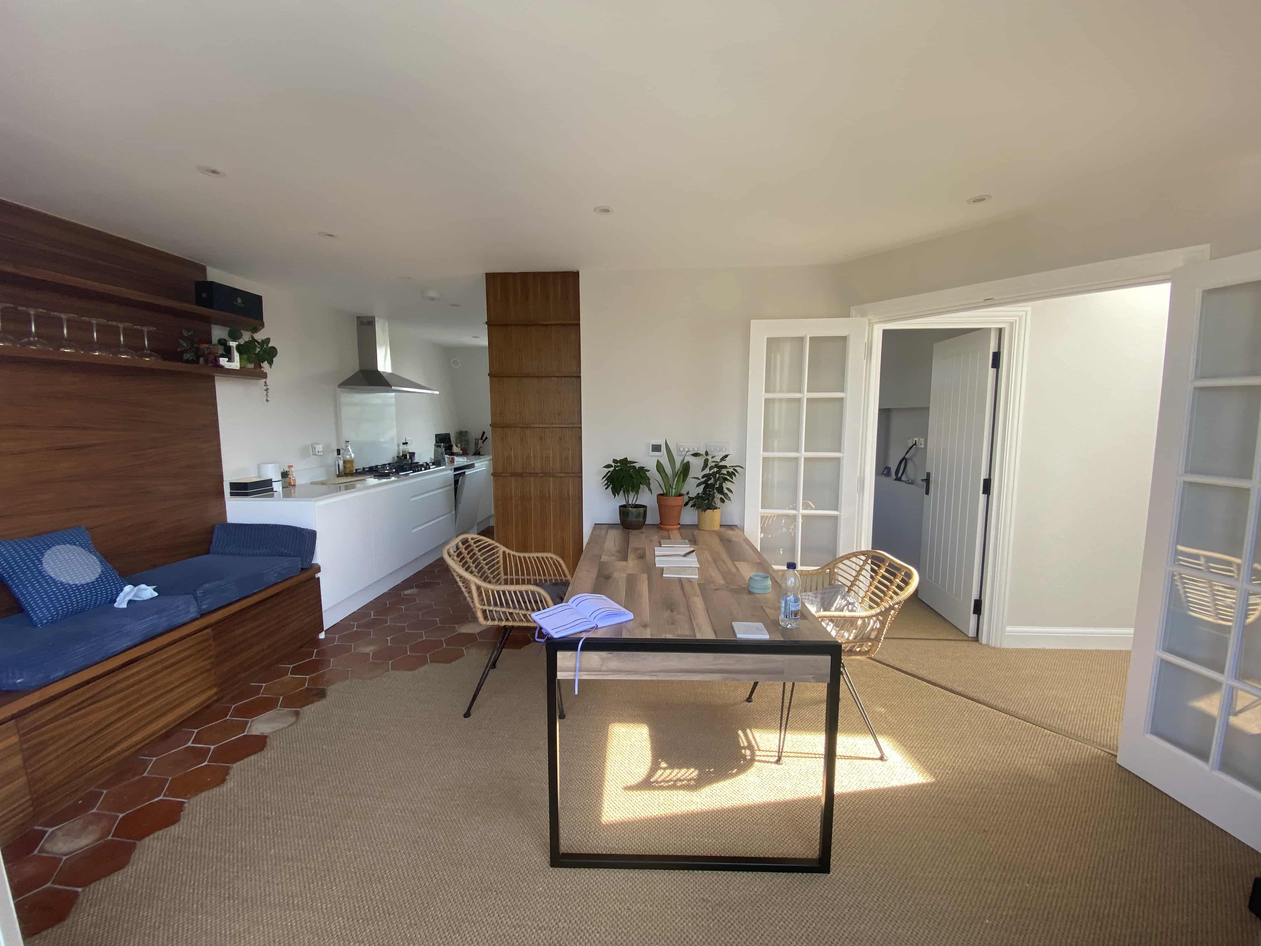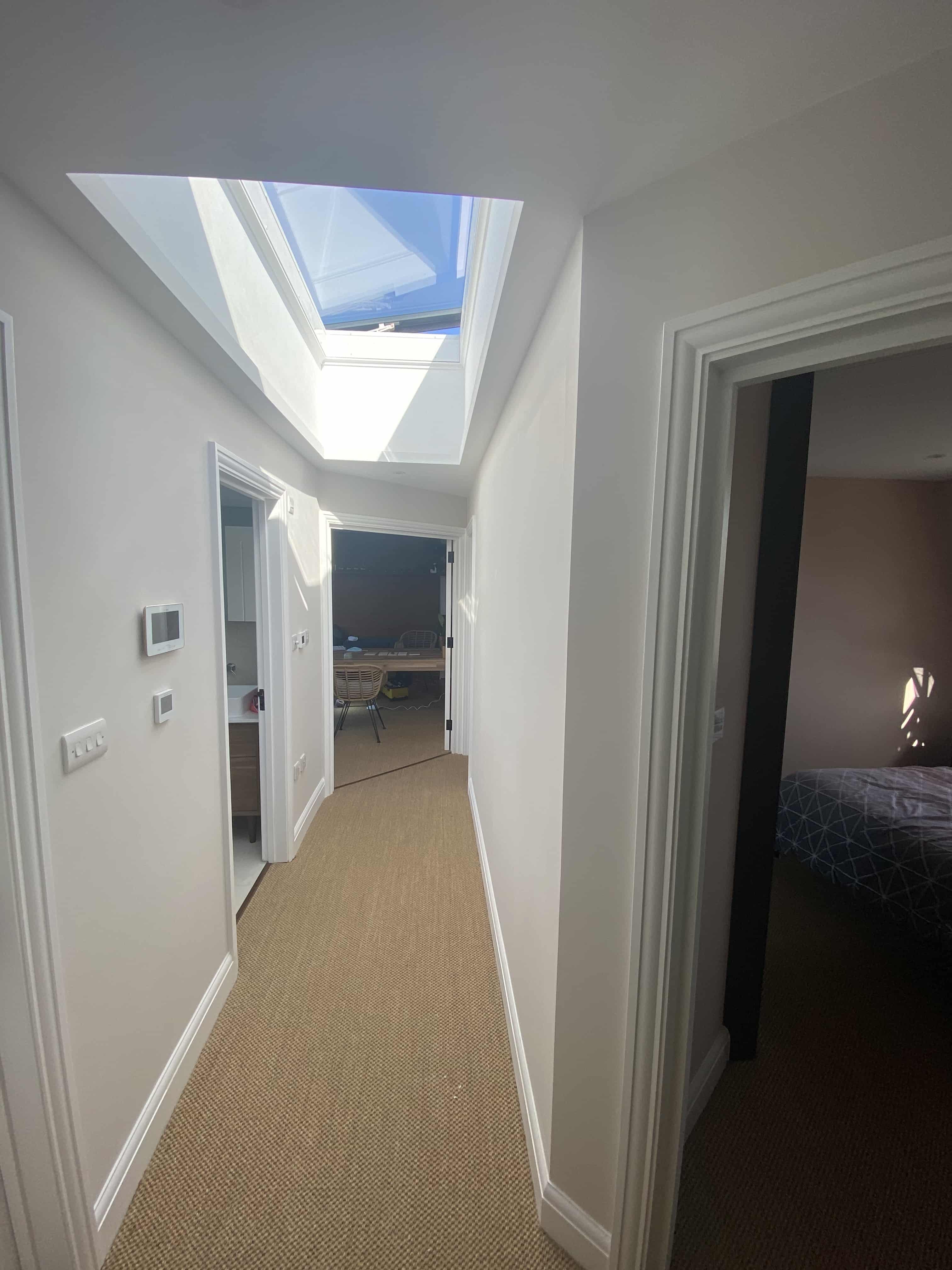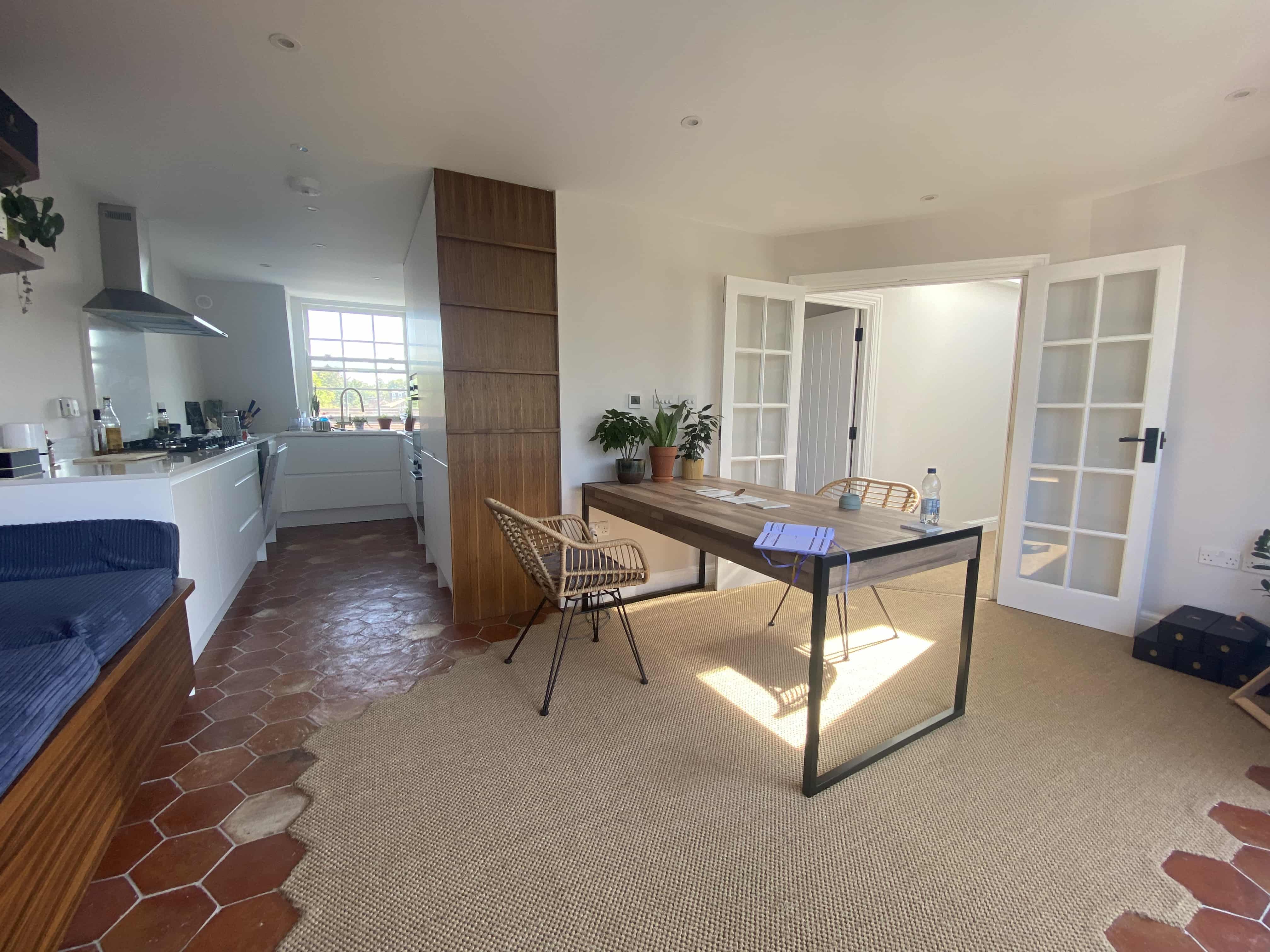 Every wall in the property was plastered and redecorated in chic neutral tones to allow the steel, wood, tile, glass and crystal finishes in each room to shine. The focal point of the home though, and the most important of our refurbishment project was the spacious dining room extension. For this, a unique design and build plan was put in place, fashioned and installed to match the lighting hung over the starkly contrasting white big doors.
